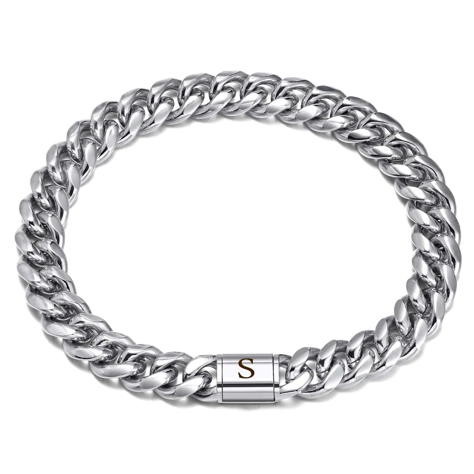 This is a luxury jewelry Cuban link chain Initials bracelet, it is equipped with a clasp that is strong and sturdy making it easy to wear with just one hand and ensuring that it stays securely in place. Whether you're dressing up for a special occasion or keeping it casual this Cuban chain men's bracelet is perfect The initials bracelet is available in silver.